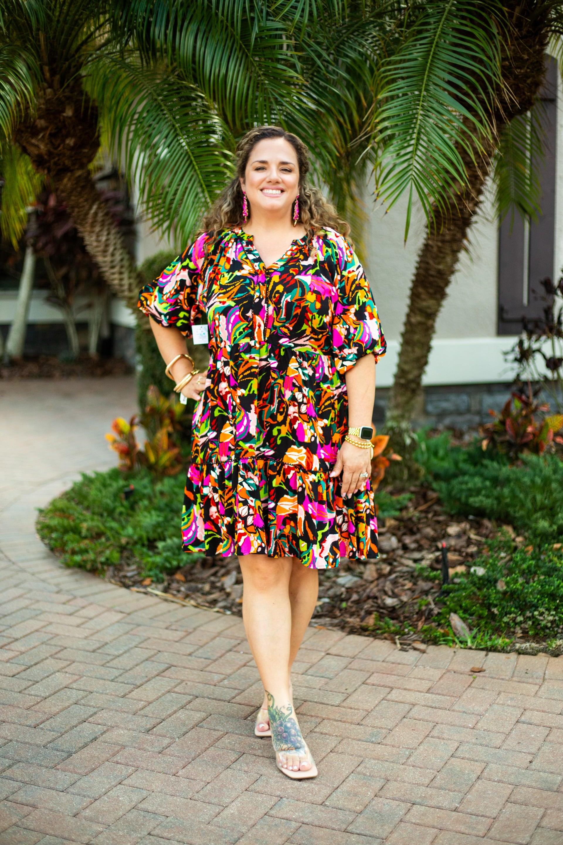 The vibrant multi-print design adds a fun pop of personality, making it easy to transition from daytime outings to evening plans. Whether youâre headed to brunch, church, or a special event, this dress delivers comfort and standout style with ease.